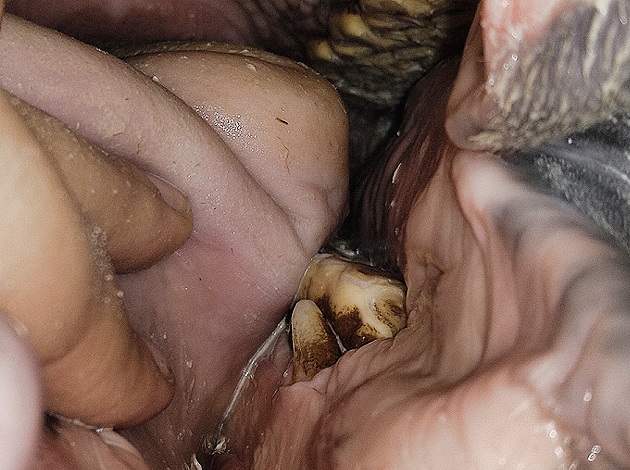 Ein eher seltener Fall: Ein Wolfszahn im Unterkiefer, der ungewöhnlich groß und zudem in Richtung Zunge verkippt ist. Da er dem Pferd jedoch keine Probleme bereitet, wird er lediglich abgerundet und regelmäßig auf Veränderungen kontrolliert.